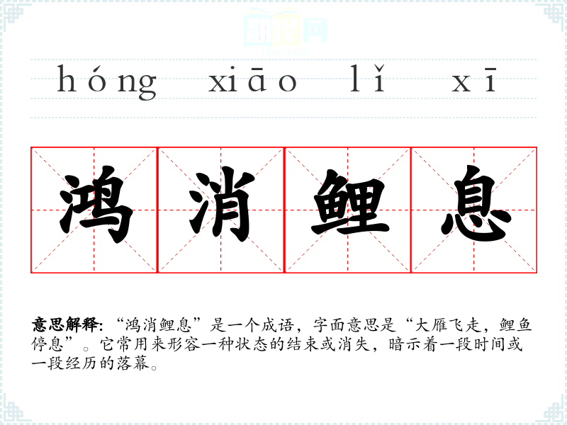 “鸿消鲤息”是一个成语,字面意思是“大雁飞走,鲤鱼停息”。它常用来形容一种状态的结束或消失,暗示着一段时间或一段经历的落幕。