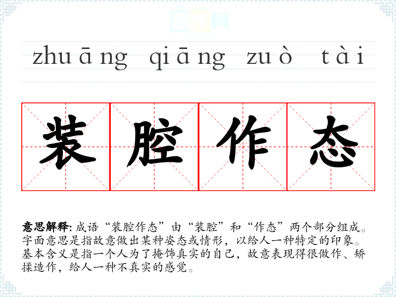 成语“装腔作态”由“装腔”和“作态”两个部分组成。字面意思是指故意做出某种姿态或情形,以给人一种特定的印象。基本含义是指一个人为了掩饰真实的自己,故意表现得很做作、矫揉造作,给人一种不真实的感觉。