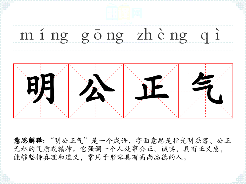 “明公正气”是一个成语,字面意思是指光明磊落、公正无私的气质或精神。它强调一个人处事公正、诚实,具有正义感,能够坚持真理和道义,常用于形容具有高尚品德的人。