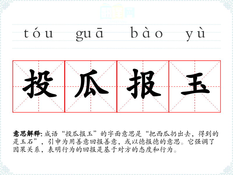成语“投瓜报玉”的字面意思是“把西瓜扔出去,得到的是玉石”,引申为用善意回报善意,或以德报德的意思。它强调了因果关系,表明行为的回报是基于对方的态度和行为。