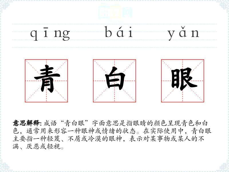 成语“青白眼”字面意思是指眼睛的颜色呈现青色和白色,通常用来形容一种眼神或情绪的状态。在实际使用中,青白眼主要指一种轻蔑、不屑或冷漠的眼神,表示对某事物或某人的不满、厌恶或轻视。