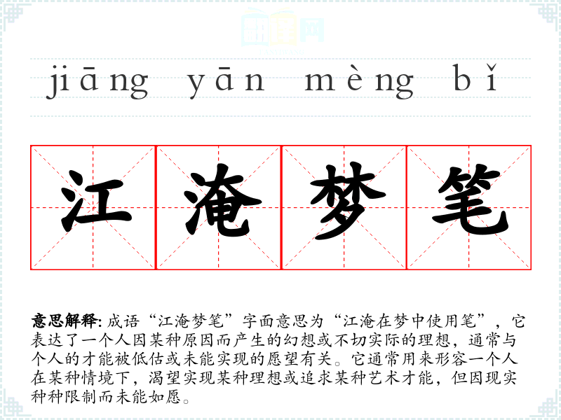 成语“江淹梦笔”字面意思为“江淹在梦中使用笔”,它表达了一个人因某种原因而产生的幻想或不切实际的理想,通常与个人的才能被低估或未能实现的愿望有关。它通常用来形容一个人在某种情境下,渴望实现某种理想或追求某种艺术才能,但因现实种种限制而未能如愿。