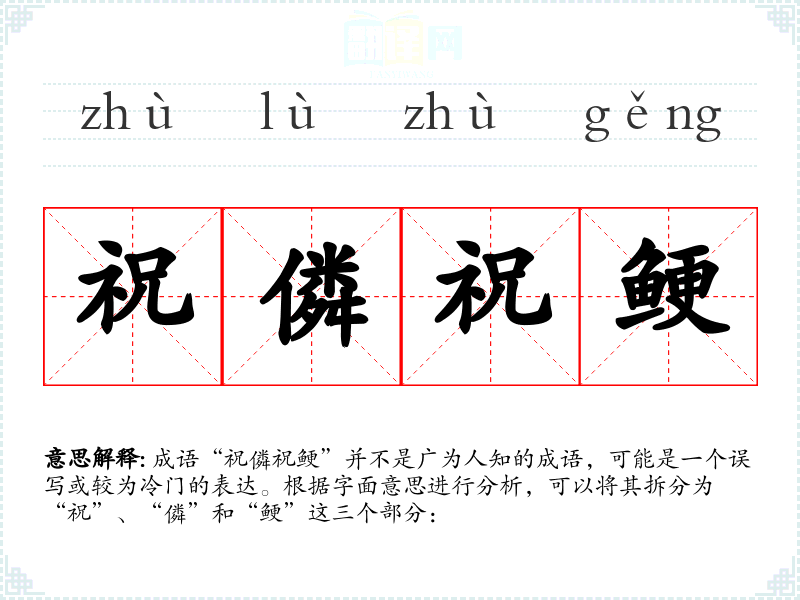 成语“祝僯祝鲠”并不是广为人知的成语,可能是一个误写或较为冷门的表达。根据字面意思进行分析,可以将其拆分为“祝”、“僯”和“鲠”这三个部分: