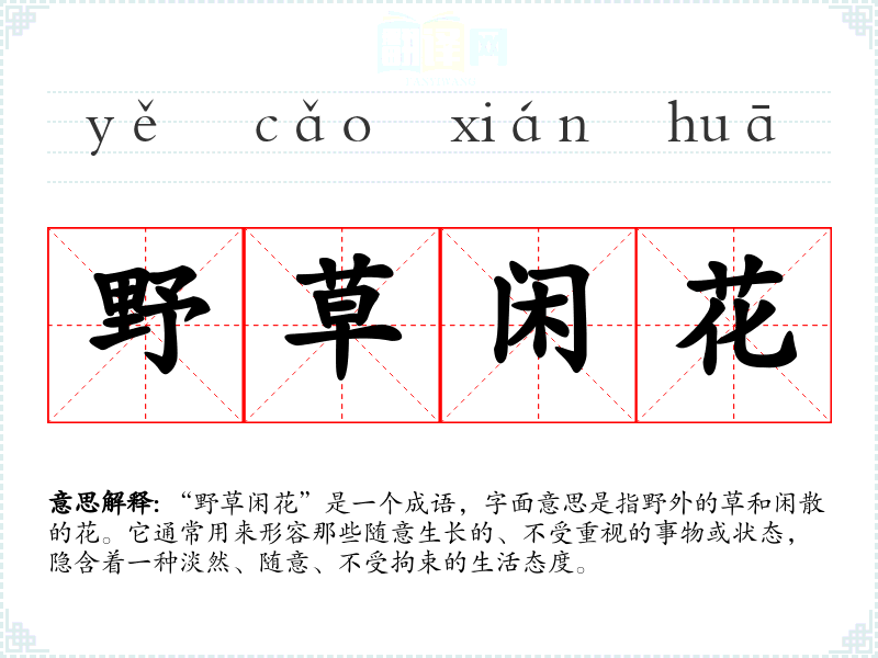 “野草闲花”是一个成语,字面意思是指野外的草和闲散的花。它通常用来形容那些随意生长的、不受重视的事物或状态,隐含着一种淡然、随意、不受拘束的生活态度。