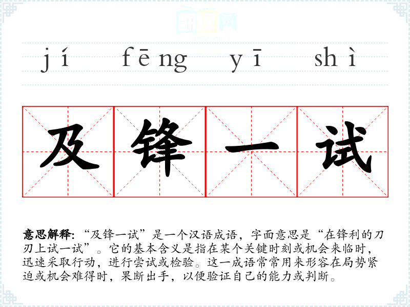 “及锋一试”是一个汉语成语,字面意思是“在锋利的刀刃上试一试”。它的基本含义是指在某个关键时刻或机会来临时,迅速采取行动,进行尝试或检验。这一成语常常用来形容在局势紧迫或机会难得时,果断出手,以便验证自己的能力或判断。