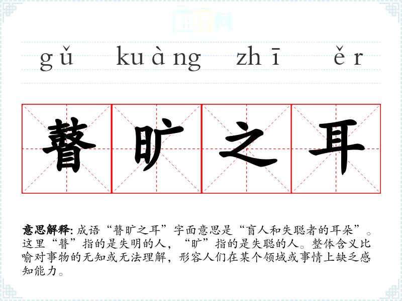 成语“瞽旷之耳”字面意思是“盲人和失聪者的耳朵”。这里“瞽”指的是失明的人,“旷”指的是失聪的人。整体含义比喻对事物的无知或无法理解,形容人们在某个领域或事情上缺乏感知能力。