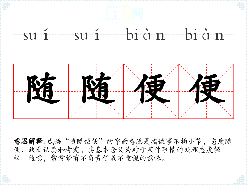 成语“随随便便”的字面意思是指做事不拘小节,态度随便,缺乏认真和考究。其基本含义为对于某件事情的处理态度轻松、随意,常常带有不负责任或不重视的意味。