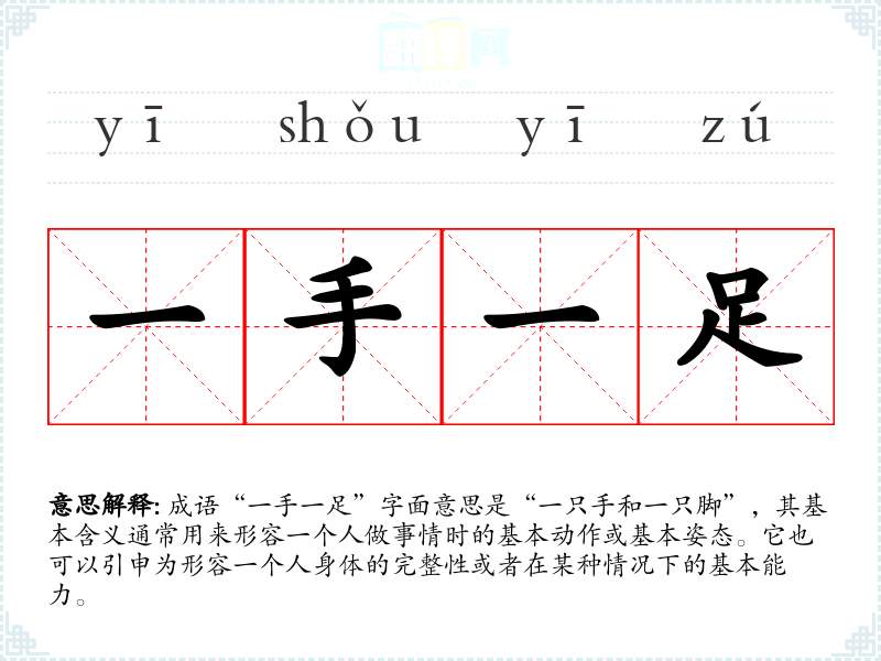 成语“一手一足”字面意思是“一只手和一只脚”,其基本含义通常用来形容一个人做事情时的基本动作或基本姿态。它也可以引申为形容一个人身体的完整性或者在某种情况下的基本能力。