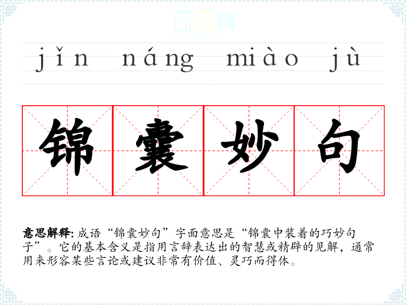 成语“锦囊妙句”字面意思是“锦囊中装着的巧妙句子”。它的基本含义是指用言辞表达出的智慧或精辟的见解,通常用来形容某些言论或建议非常有价值、灵巧而得体。