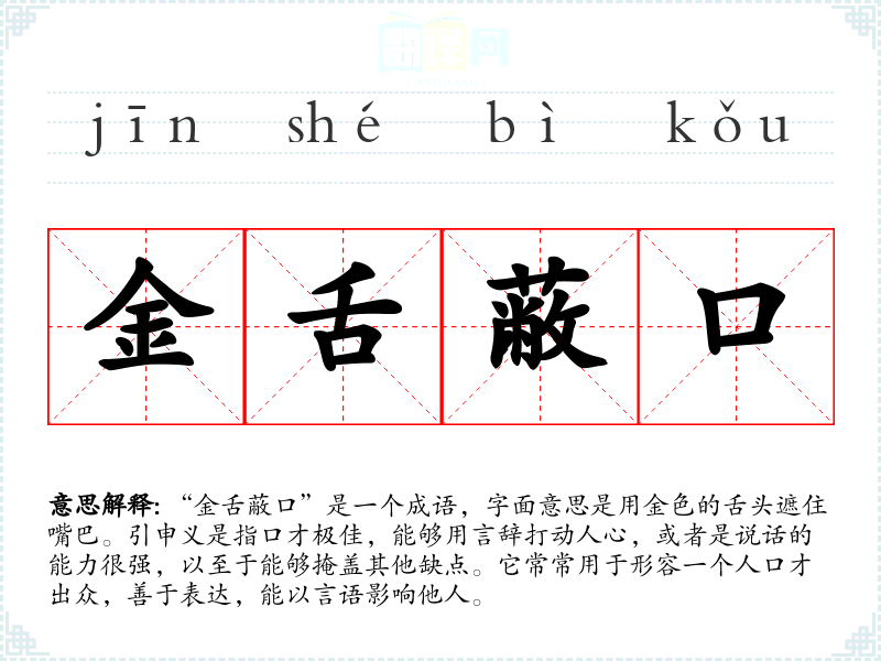 “金舌蔽口”是一个成语,字面意思是用金色的舌头遮住嘴巴。引申义是指口才极佳,能够用言辞打动人心,或者是说话的能力很强,以至于能够掩盖其他缺点。它常常用于形容一个人口才出众,善于表达,能以言语影响他人。