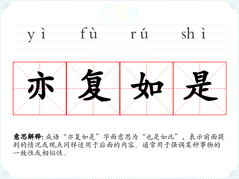 成语“亦复如是”字面意思为“也是如此”,表示前面提到的情况或观点同样适用于后面的内容。通常用于强调某种事物的一致性或相似性。