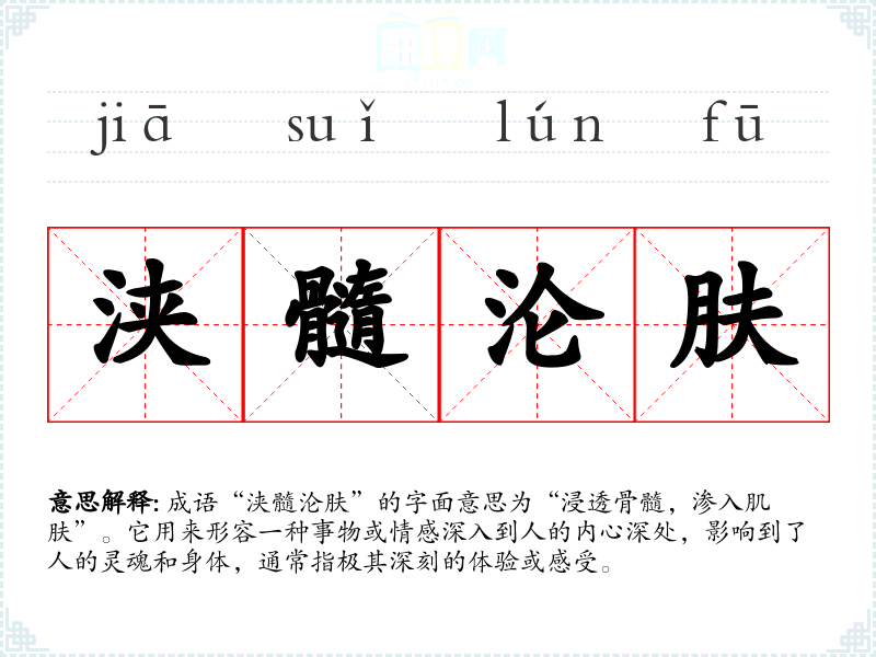 成语“浃髓沦肤”的字面意思为“浸透骨髓,渗入肌肤”。它用来形容一种事物或情感深入到人的内心深处,影响到了人的灵魂和身体,通常指极其深刻的体验或感受。
