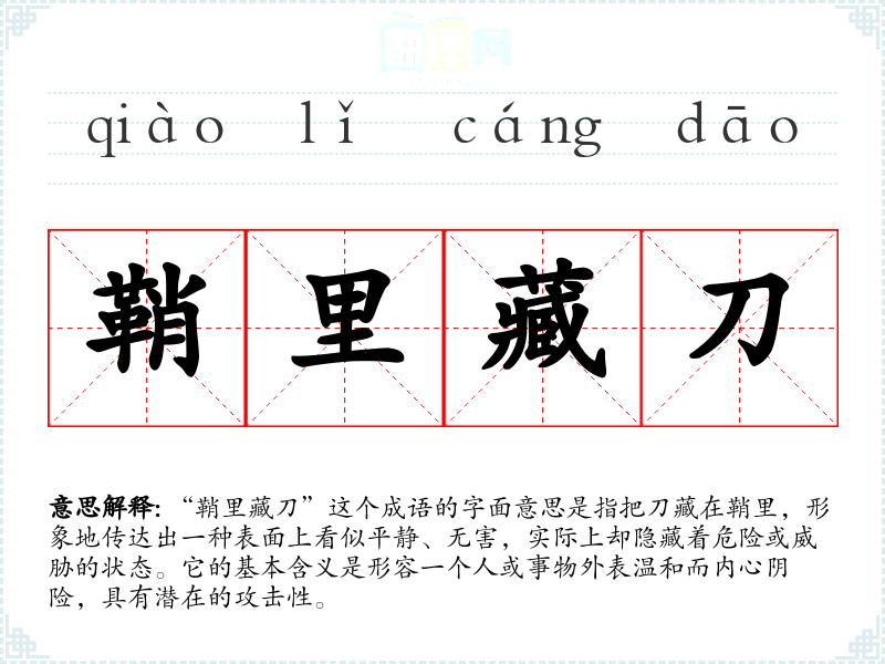 “鞘里藏刀”这个成语的字面意思是指把刀藏在鞘里,形象地传达出一种表面上看似平静、无害,实际上却隐藏着危险或威胁的状态。它的基本含义是形容一个人或事物外表温和而内心阴险,具有潜在的攻击性。