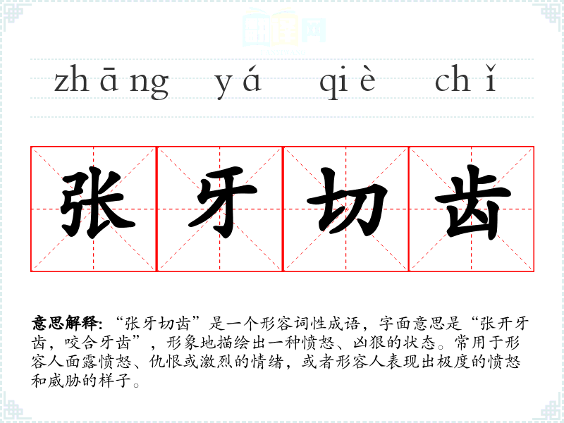 “张牙切齿”是一个形容词性成语,字面意思是“张开牙齿,咬合牙齿”,形象地描绘出一种愤怒、凶狠的状态。常用于形容人面露愤怒、仇恨或激烈的情绪,或者形容人表现出极度的愤怒和威胁的样子。