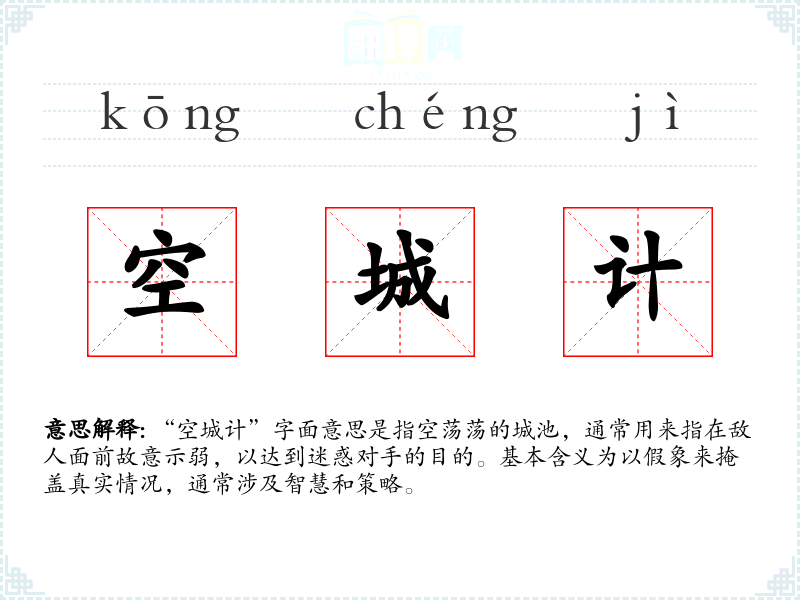 “空城计”字面意思是指空荡荡的城池,通常用来指在敌人面前故意示弱,以达到迷惑对手的目的。基本含义为以假象来掩盖真实情况,通常涉及智慧和策略。