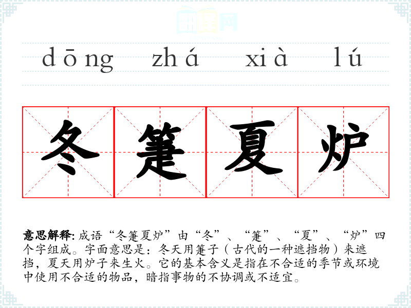 成语“冬箑夏炉”由“冬”、“箑”、“夏”、“炉”四个字组成。字面意思是:冬天用箑子(古代的一种遮挡物)来遮挡,夏天用炉子来生火。它的基本含义是指在不合适的季节或环境中使用不合适的物品,暗指事物的不协调或不适宜。