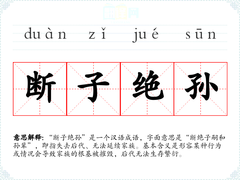 “断子绝孙”是一个汉语成语,字面意思是“断绝子嗣和孙辈”,即指失去后代、无法延续家族。基本含义是形容某种行为或情况会导致家族的根基被摧毁,后代无法生存繁衍。