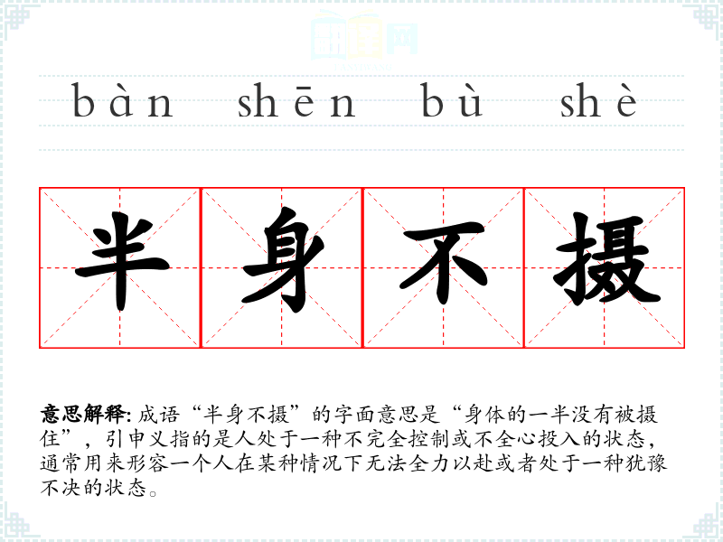 成语“半身不摄”的字面意思是“身体的一半没有被摄住”,引申义指的是人处于一种不完全控制或不全心投入的状态,通常用来形容一个人在某种情况下无法全力以赴或者处于一种犹豫不决的状态。