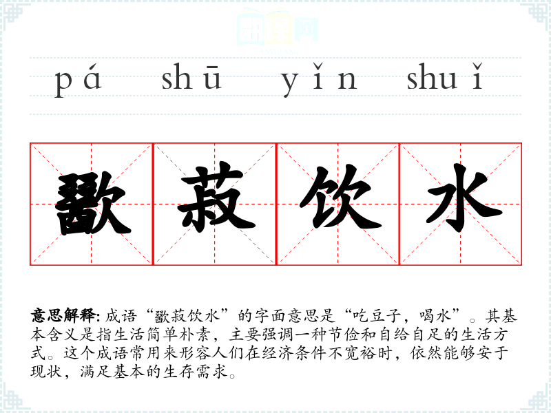 成语“歠菽饮水”的字面意思是“吃豆子,喝水”。其基本含义是指生活简单朴素,主要强调一种节俭和自给自足的生活方式。这个成语常用来形容人们在经济条件不宽裕时,依然能够安于现状,满足基本的生存需求。