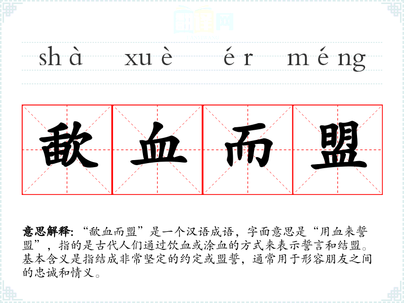 | 歃血为盟 | 歃血:古代会盟,把牲畜的血涂在嘴唇上,表示诚意;盟:宣誓缔约。泛指发誓订盟。 |