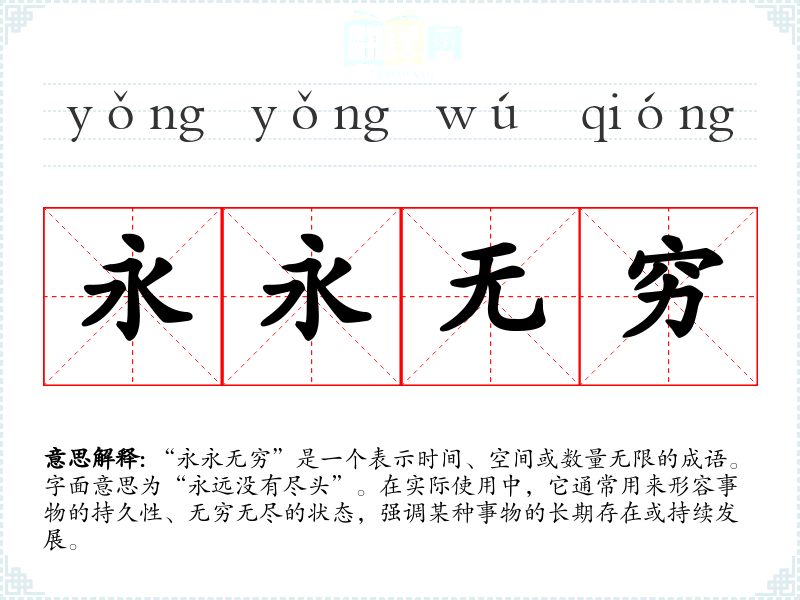 “永永无穷”是一个表示时间、空间或数量无限的成语。字面意思为“永远没有尽头”。在实际使用中,它通常用来形容事物的持久性、无穷无尽的状态,强调某种事物的长期存在或持续发展。
