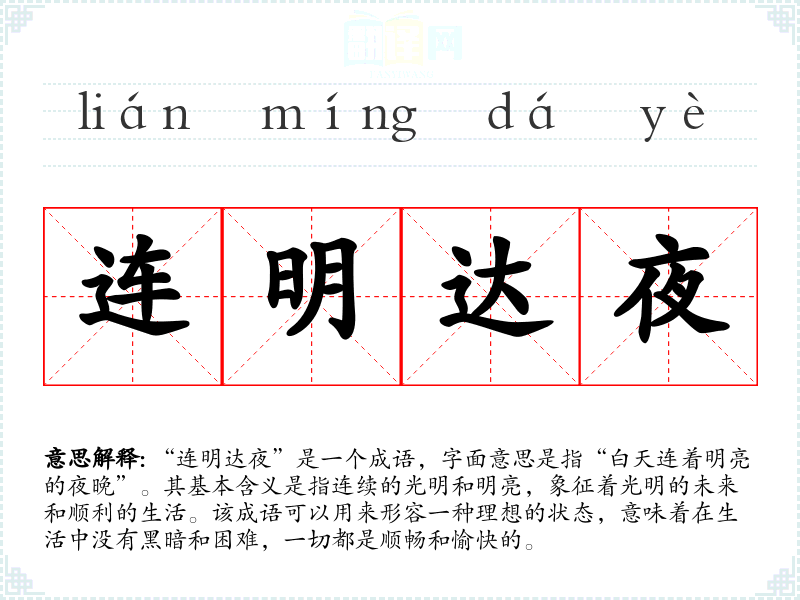 “连明达夜”是一个成语,字面意思是指“白天连着明亮的夜晚”。其基本含义是指连续的光明和明亮,象征着光明的未来和顺利的生活。该成语可以用来形容一种理想的状态,意味着在生活中没有黑暗和困难,一切都是顺畅和愉快的。
