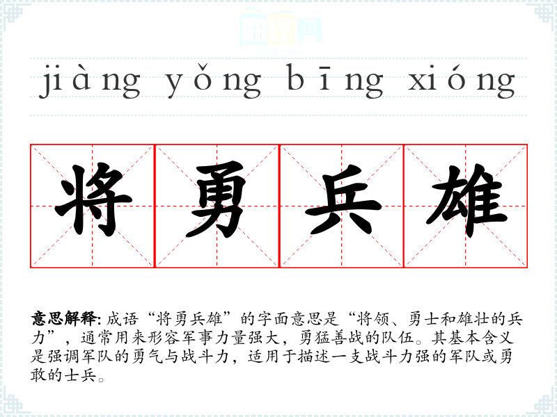 | 将勇兵雄 | 将:将领;兵:士卒;雄:强有力。将领和士兵都英勇威武。形容军队战斗力很强。 |