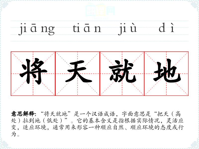 “将天就地”是一个汉语成语,字面意思是“把天(高处)拉到地(低处)”。它的基本含义是指根据实际情况,灵活应变,适应环境,通常用来形容一种顺应自然、顺应环境的态度或行为。