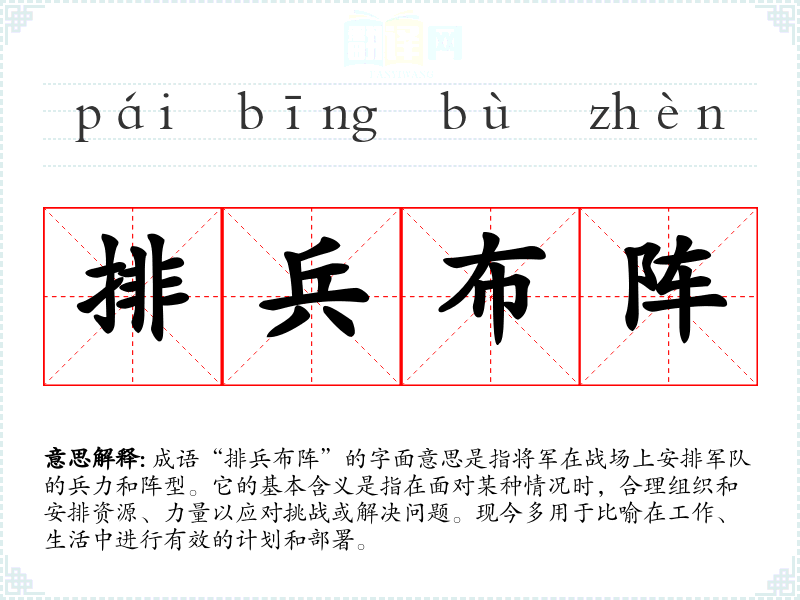 成语“排兵布阵”的字面意思是指将军在战场上安排军队的兵力和阵型。它的基本含义是指在面对某种情况时,合理组织和安排资源、力量以应对挑战或解决问题。现今多用于比喻在工作、生活中进行有效的计划和部署。