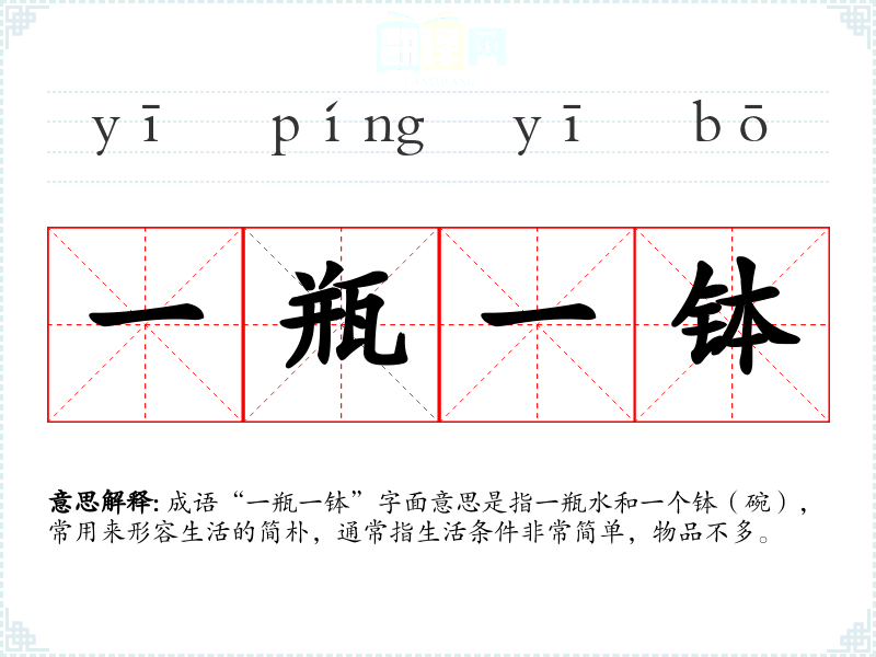 成语“一瓶一钵”字面意思是指一瓶水和一个钵(碗),常用来形容生活的简朴,通常指生活条件非常简单,物品不多。