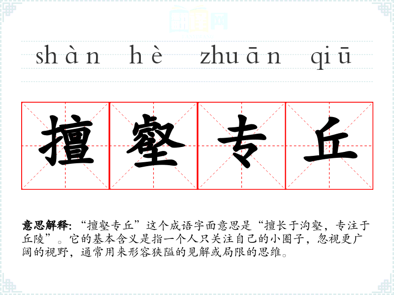 “擅壑专丘”这个成语字面意思是“擅长于沟壑,专注于丘陵”。它的基本含义是指一个人只关注自己的小圈子,忽视更广阔的视野,通常用来形容狭隘的见解或局限的思维。