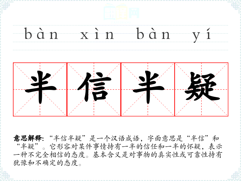 “半信半疑”是一个汉语成语,字面意思是“半信”和“半疑”。它形容对某件事情持有一半的信任和一半的怀疑,表示一种不完全相信的态度。基本含义是对事物的真实性或可靠性持有犹豫和不确定的态度。