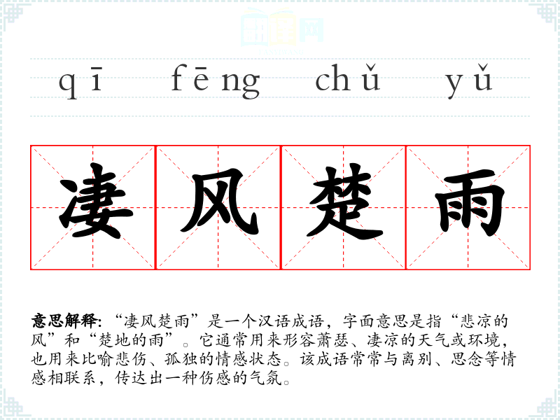 “凄风楚雨”源自古代文学,最早可以追溯到《楚辞》。其中,楚地以多雨而著称,凄风楚雨则反映了楚地特有的自然景观和气候特征。成语中“凄风”与“楚雨”结合,传达出一种悲凉的意境,常用于表达离别、思念或忧伤的情感。