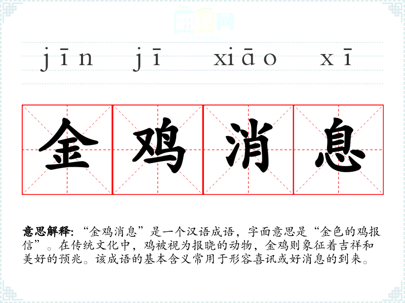 在英语中,类似的表达可以是“good news”或“a pleasant surprise”。然而,文化背景不同,使得“金鸡消息”所承载的吉祥与美好的寓意在其他文化中可能没有那么直接的对应。