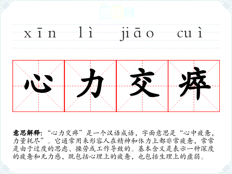 “心力交瘁”是一个汉语成语,字面意思是“心中疲惫,力量耗尽”。它通常用来形容人在精神和体力上都非常疲惫,常常是由于过度的思虑、操劳或工作导致的。基本含义是表示一种深度的疲惫和无力感,既包括心理上的疲惫,也包括生理上的虚弱。