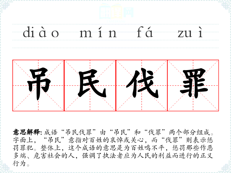 成语“吊民伐罪”由“吊民”和“伐罪”两个部分组成。字面上,“吊民”意指对百姓的哀悼或关心,而“伐罪”则表示惩罚罪犯。整体上,这个成语的意思是为百姓鸣不平,惩罚那些作恶多端、危害社会的人,强调了执法者应为人民的利益而进行的正义行为。