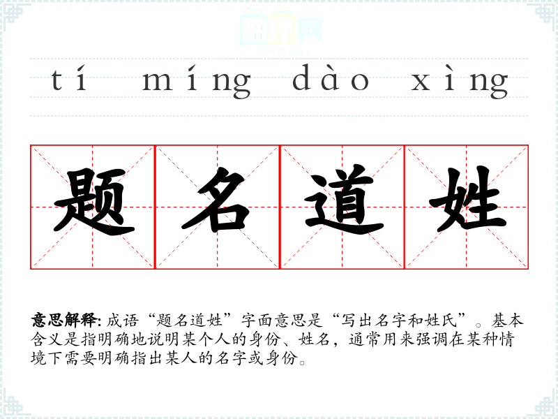 成语“题名道姓”字面意思是“写出名字和姓氏”。基本含义是指明确地说明某个人的身份、姓名,通常用来强调在某种情境下需要明确指出某人的名字或身份。