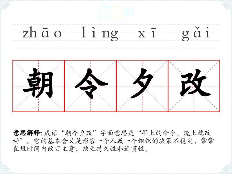 成语“朝令夕改”字面意思是“早上的命令,晚上就改动”。它的基本含义是形容一个人或一个组织的决策不稳定,常常在短时间内改变主意,缺乏持久性和连贯性。