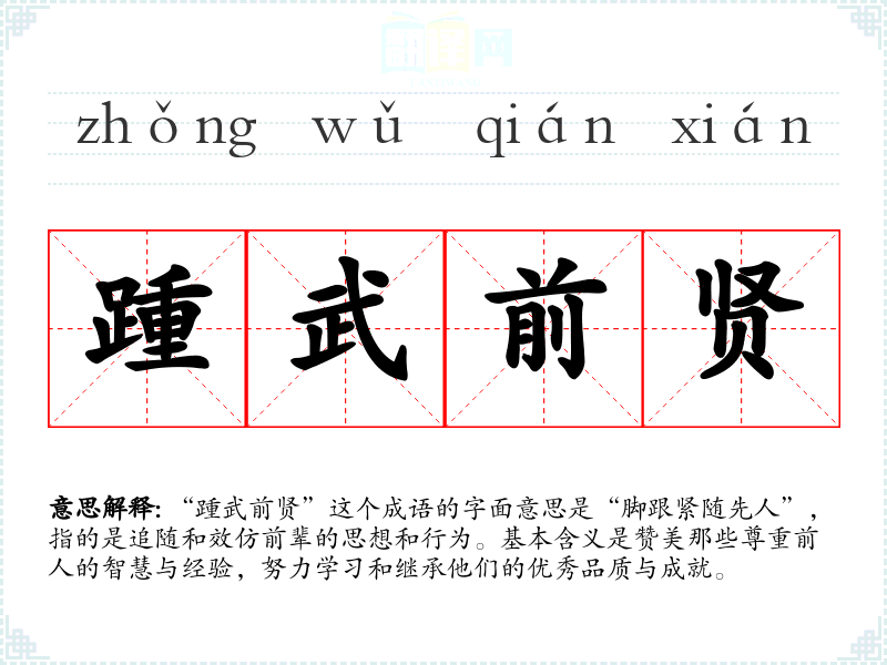 “踵武前贤”这个成语的字面意思是“脚跟紧随先人”,指的是追随和效仿前辈的思想和行为。基本含义是赞美那些尊重前人的智慧与经验,努力学*和继承他们的优秀品质与成就。
