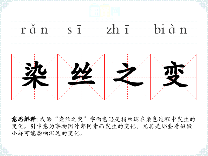 成语“染丝之变”字面意思是指丝绸在染色过程中发生的变化。引申意为事物因外部因素而发生的变化,尤其是那些看似微小却可能影响深远的变化。