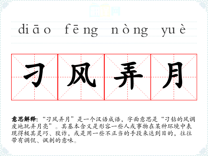 “刁风弄月”是一个汉语成语,字面意思是“刁钻的风调皮地玩弄月亮”。其基本含义是形容一些人或事物在某种环境中表现得极其灵巧、狡诈,或是用一些不正当的手段来达到目的,往往带有调侃、讽刺的意味。