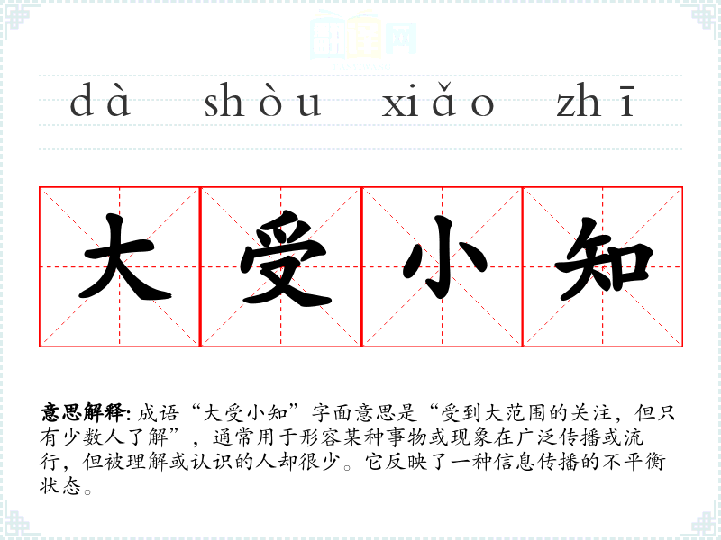 成语“大受小知”字面意思是“受到大范围的关注,但只有少数人了解”,通常用于形容某种事物或现象在广泛传播或流行,但被理解或认识的人却很少。它反映了一种信息传播的不平衡状态。