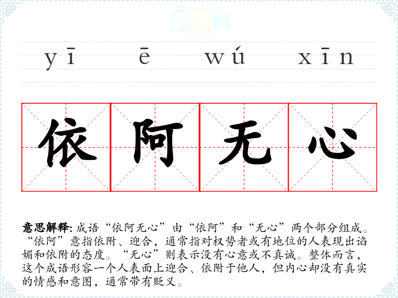 成语“依阿无心”由“依阿”和“无心”两个部分组成。“依阿”意指依附、迎合,通常指对权势者或有地位的人表现出谄媚和依附的态度。“无心”则表示没有心意或不真诚。整体而言,这个成语形容一个人表面上迎合、依附于他人,但内心却没有真实的情感和意图,通常带有贬义。
