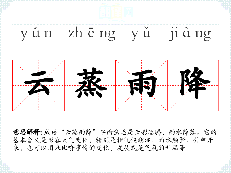 “云蒸雨降”源于**古代诗词,最早见于唐代诗人李白的《夜泊牛津口》。成语本身描绘了自然界中云朵和雨水的动态变化,这种变化既有自然规律,也暗含了人生的起伏与变化。