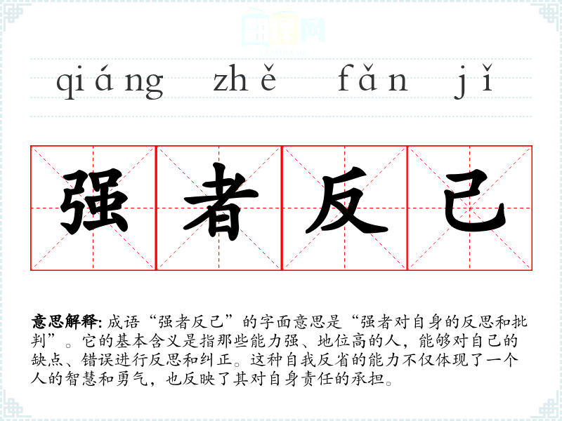 成语“强者反己”的字面意思是“强者对自身的反思和批判”。它的基本含义是指那些能力强、地位高的人,能够对自己的缺点、错误进行反思和纠正。这种自我反省的能力不仅体现了一个人的智慧和勇气,也反映了其对自身责任的承担。
