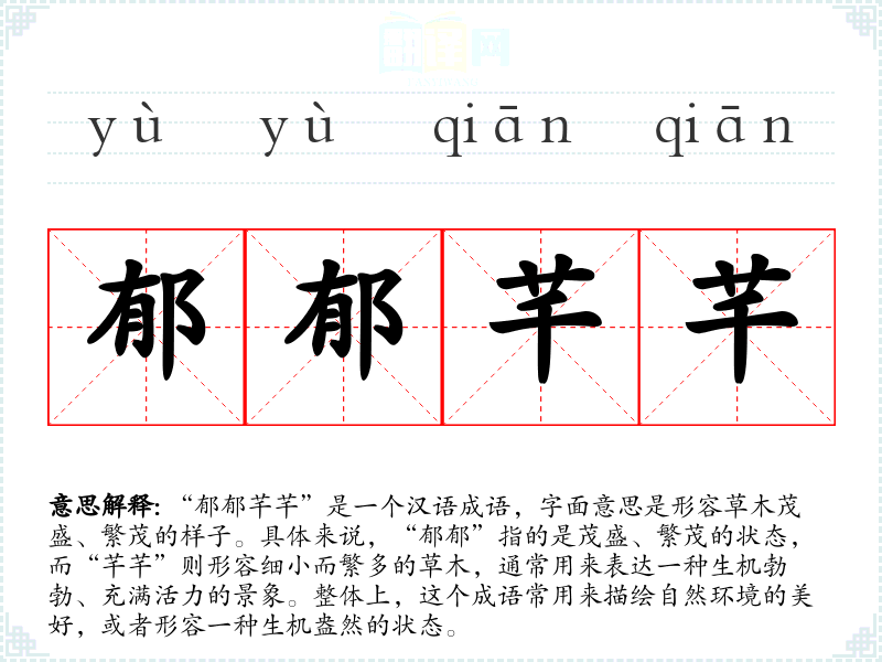 “郁郁芊芊”是一个汉语成语,字面意思是形容草木茂盛、繁茂的样子。具体来说,“郁郁”指的是茂盛、繁茂的状态,而“芊芊”则形容细小而繁多的草木,通常用来表达一种生机勃勃、充满活力的景象。整体上,这个成语常用来描绘自然环境的美好,或者形容一种生机盎然的状态。
