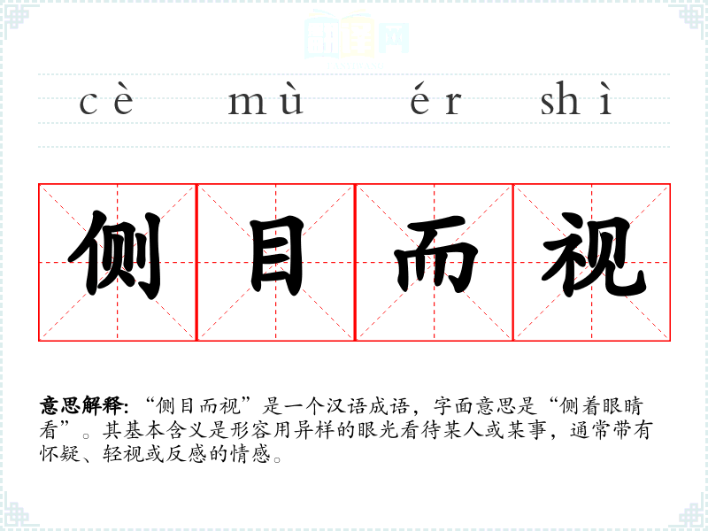 “侧目而视”是一个汉语成语,字面意思是“侧着眼睛看”。其基本含义是形容用异样的眼光看待某人或某事,通常带有怀疑、轻视或反感的情感。