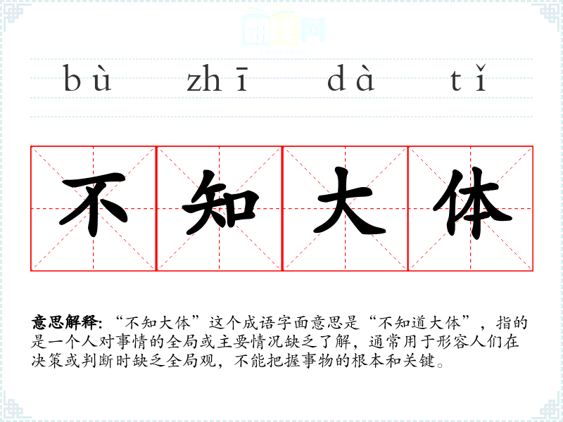 “不知大体”这个成语字面意思是“不知道大体”,指的是一个人对事情的全局或主要情况缺乏了解,通常用于形容人们在决策或判断时缺乏全局观,不能把握事物的根本和关键。