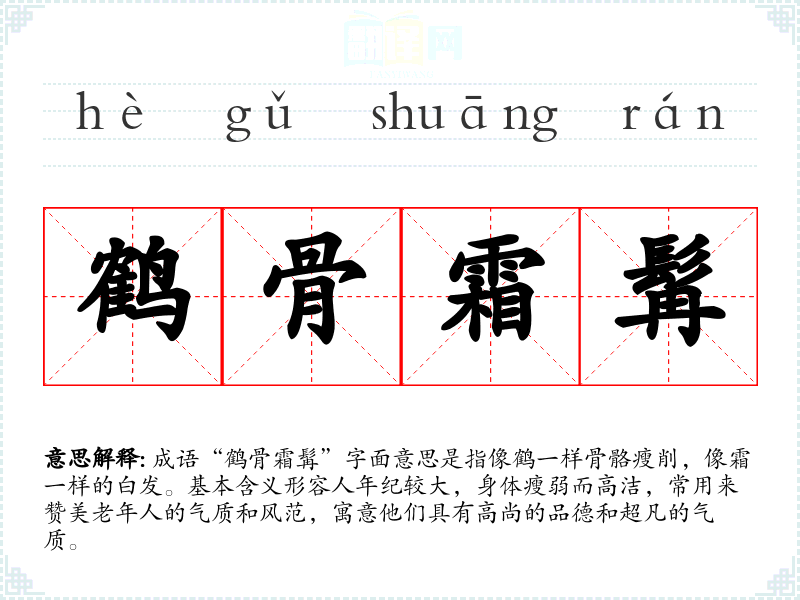 成语“鹤骨霜髯”字面意思是指像鹤一样骨骼瘦削,像霜一样的白发。基本含义形容人年纪较大,身体瘦弱而高洁,常用来赞美老年人的气质和风范,寓意他们具有高尚的品德和超凡的气质。