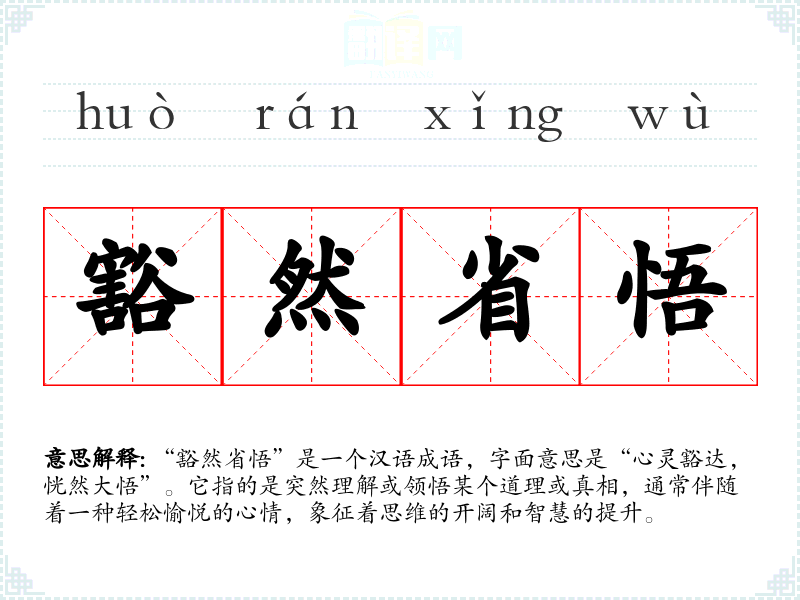 “豁然省悟”是一个汉语成语,字面意思是“心灵豁达,恍然大悟”。它指的是突然理解或领悟某个道理或真相,通常伴随着一种轻松愉悦的心情,象征着思维的开阔和智慧的提升。